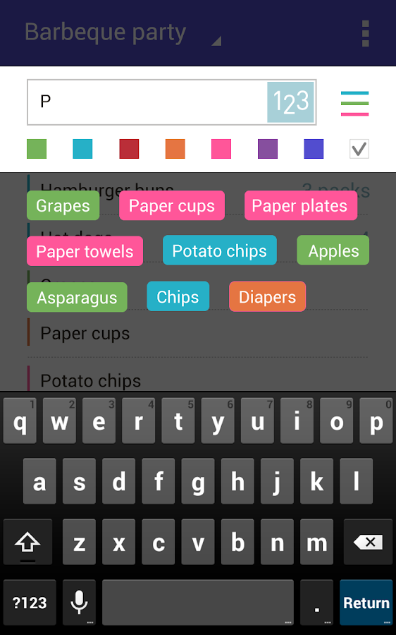 * Smart grouping: Simply assign a color to the items belonging to the same group (eg store aisle) and the app will then group the items in the list automatically